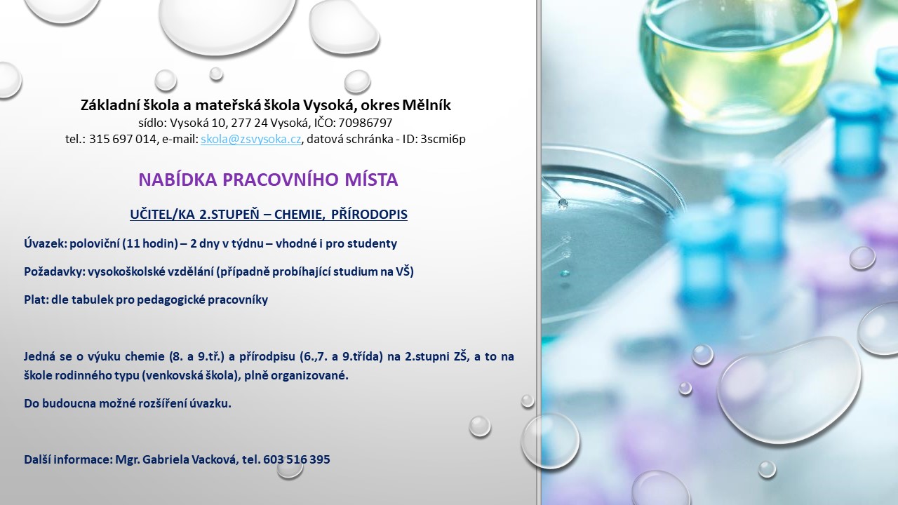 ZŠ a MŠ Vysoká, okres Mělník přijme učitele chemie a přírodopisu pro 2. stupeň. Více informací zde. (zveřejněno 7.6.2023)