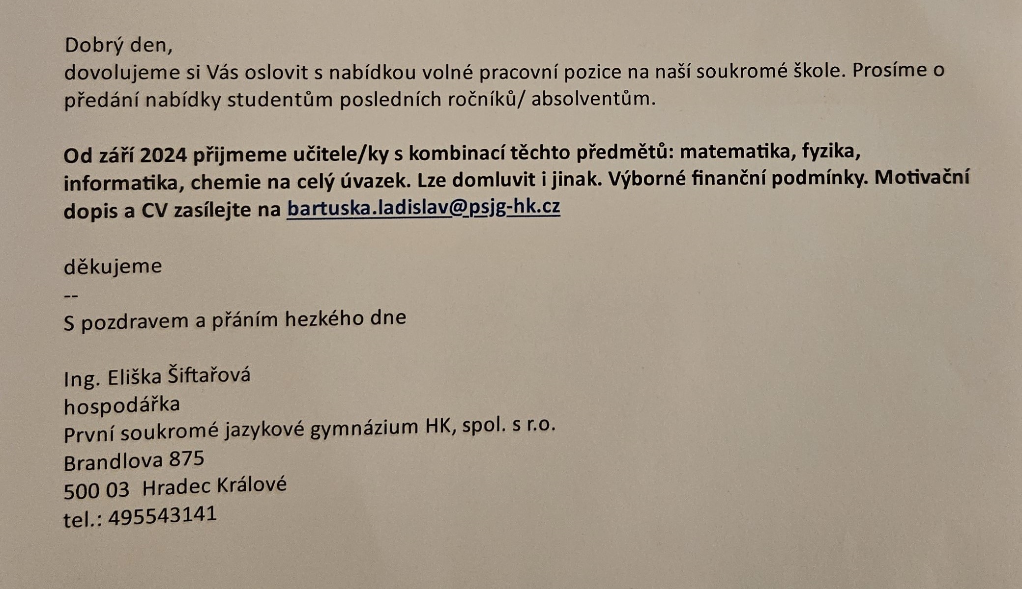 První soukromé jazykové gymnázium HK, spol. s r. o. přijme učitele/ ky s kombinací předmětů: matematika, fyzika, informatika, chemie. Nástup od září 2024. Více informací zde. (zveřejněno 14.3.2024)