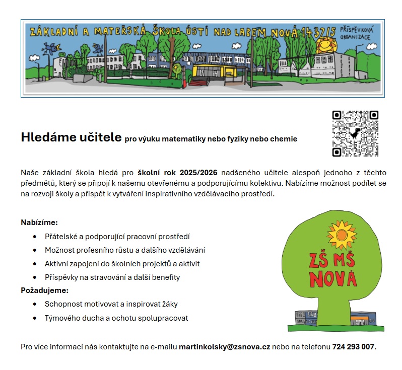 ZŠ a MŠ Ústí nad Labem Nová 1432/5 přijme učitele matematiky, fyziky nebo chemie pro školní rok 2025/ 26. Více informací zde. (zveřejněno 22.5.2025)
